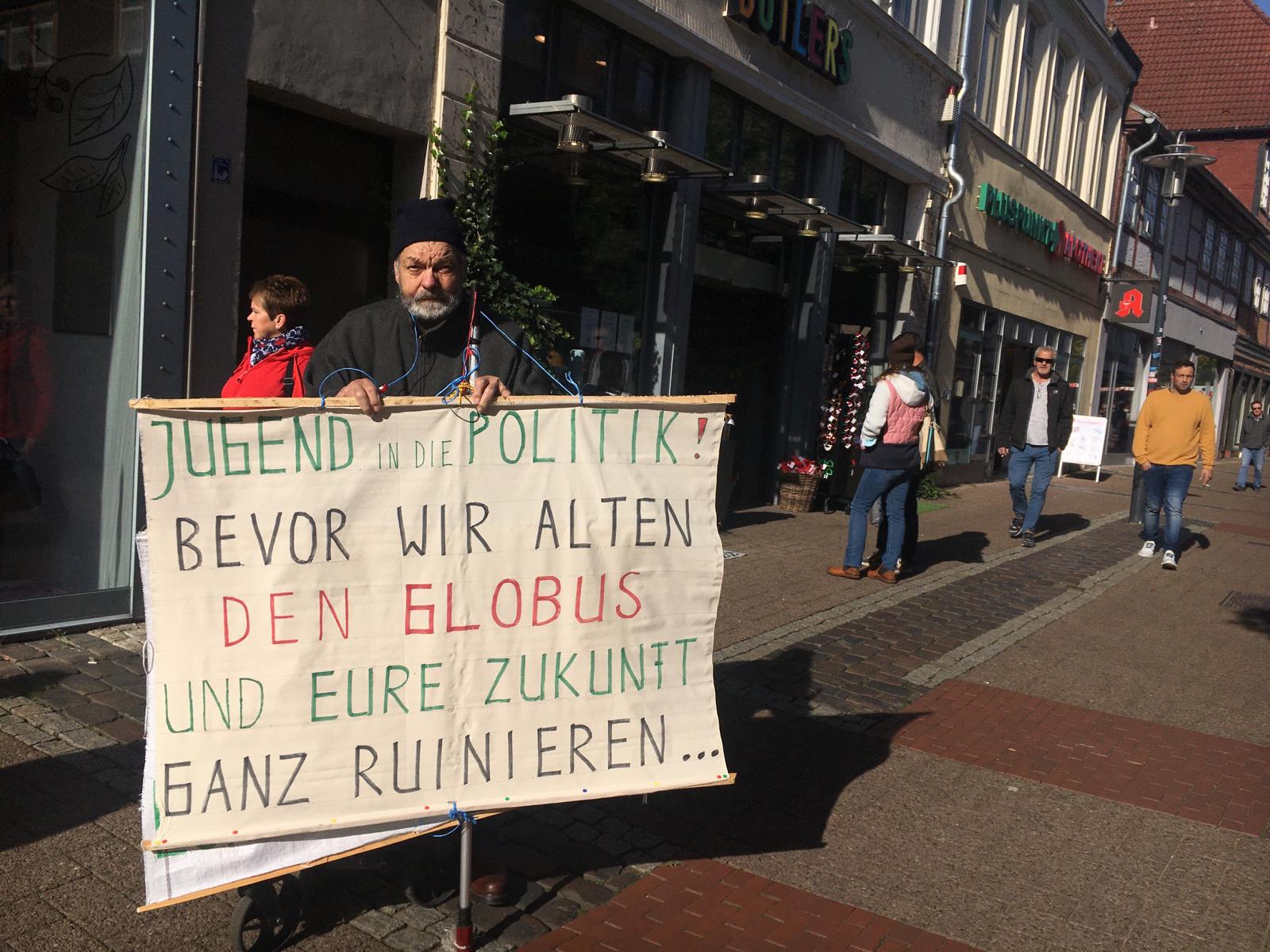 Einsam steht Dr. Max Schulz-Stellenfleth in der Stader Innenstadt und fordert mit einem Plakat die Jugend auf, sich in der Politik zu engagieren “bevor wir Alten … den Globus ruinieren”.