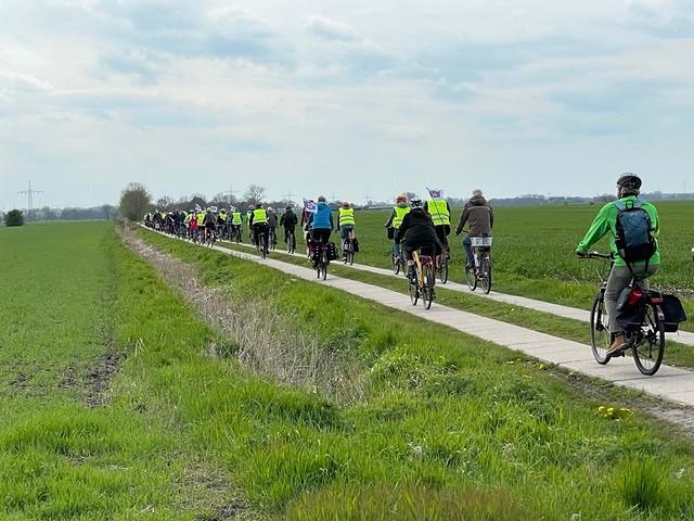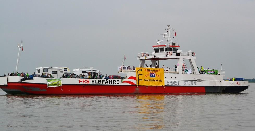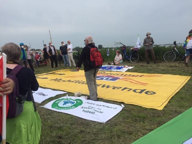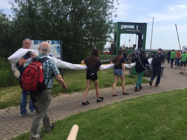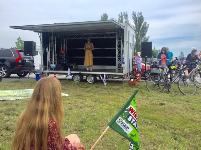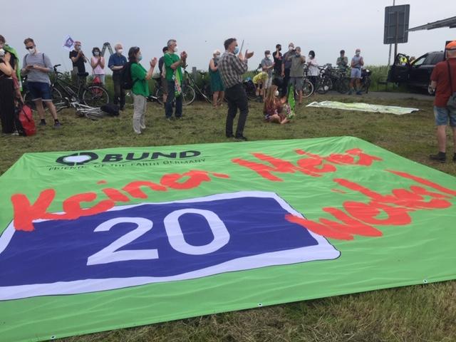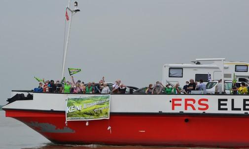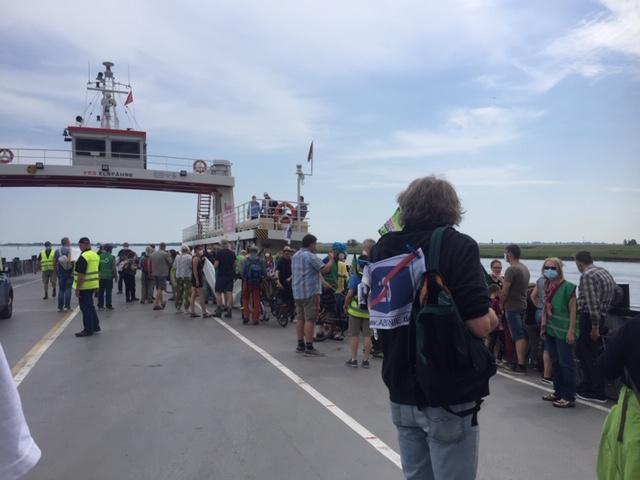 Etwa 100 Menschen versammelten sich am Sonnabend dem 5. Juni am Fähranleger in Wischhafen, um gemeinsam mit den Autobahngegnern in Schleswig-Holstein gegen den geplanten Bau der A20 zu protestieren. Mit ihren Fahrrädern und vielen Transparenten zog die bunte Truppe auf die Fähre und wurde auf der anderen Elbseite von ihren Mitkämpfern und Kämpferinnen aus Schleswig-Holstein begrüßt. In einer Kundgebung am Fähranleger Glückstadt sagte Heiner Baumgarten, Landesvorsitzender des BUND Niedersachsen, dass ein weiterer Autobahnbau angesichts der drohenden Klimakrise nicht zu verantworten sei. 80% der Trasse würde durch Moore und Marschboden führen. Das bedeute nicht nur eine enorme Flächenversiegelung, sondern auch die Freisetzung von immensen Mengen an CO2. Die LKWs müssen endlich auf die Schiene und nicht auf eine neue Autobahn.